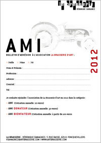 The friends of LA BRASSERIE The Association of La Brasserie aims to promote contemporary art and its various disciplines through exhibitions and events related thereto, to lead a cultural network with the professional art education projects around and to disclose contemporary art to an audience waiting for proposals quality in an unusual context. The entire team of Brasserie aims to bring collectors, hobbyists and professionals carried by the same enthusiasm and the same interest in the visual arts, the objective being to create a network capable of awareness and to encourage our actions. Friends of La Brasserie, providing support to projects, helping to bring into existence an independent place in all its missions, are invited to speak during debates and activities within the framework of exhibitions, and participate in the radiation of the place. To join the Friends of La Brasserie, just to be a member. Becoming a Friend is: